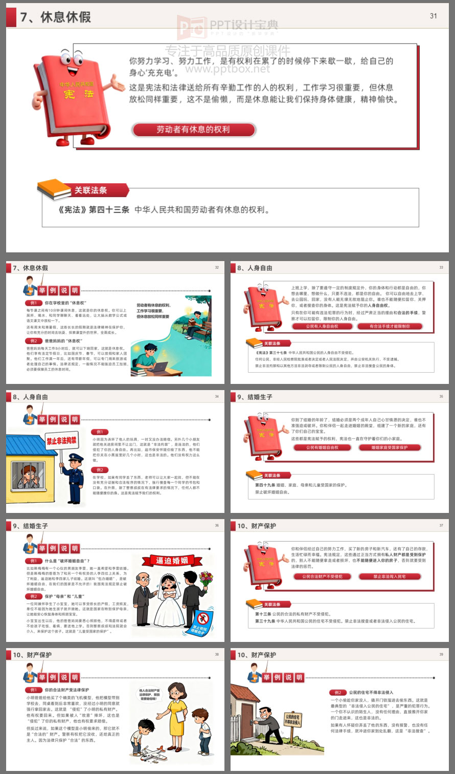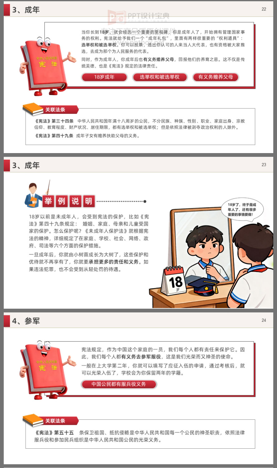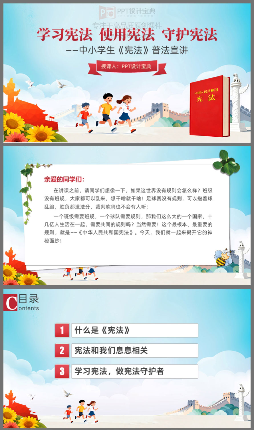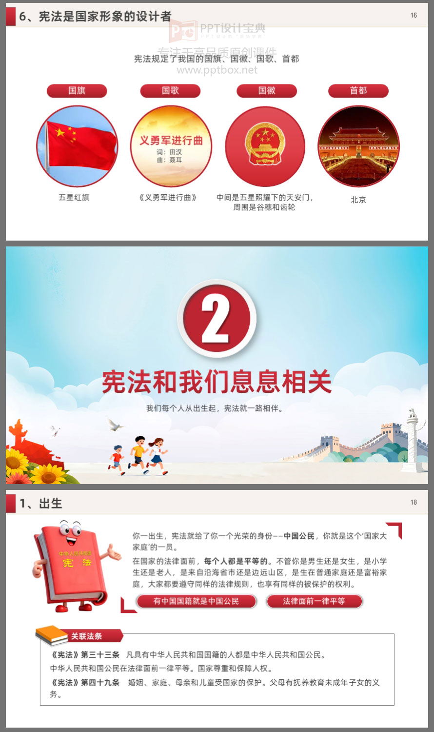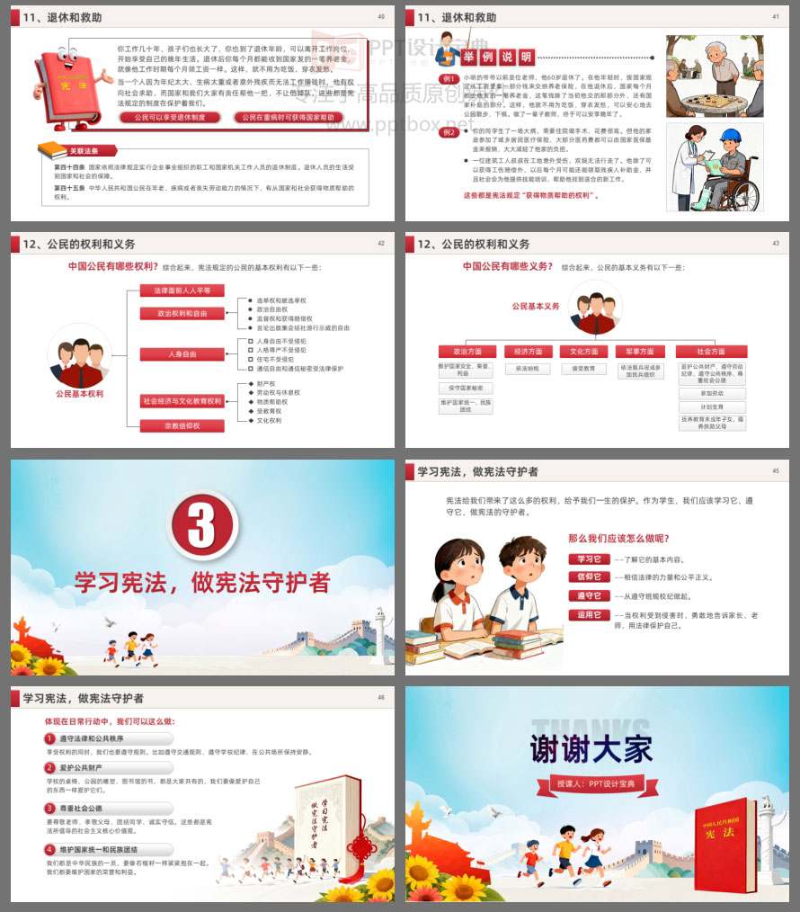 这是一个给青少年《宪法》普法PPT,以2018年修订版宪法为蓝本,图文并茂的讲了宪法的地位和作用、重点讲了宪法与我们的一生的关系,讲解了公民的权利和义务,适合于国家宪法日普法、中小学生法治教育课等。本PPT共47页,内含WORD讲稿,图文并茂,设计精美,易于编辑修改。