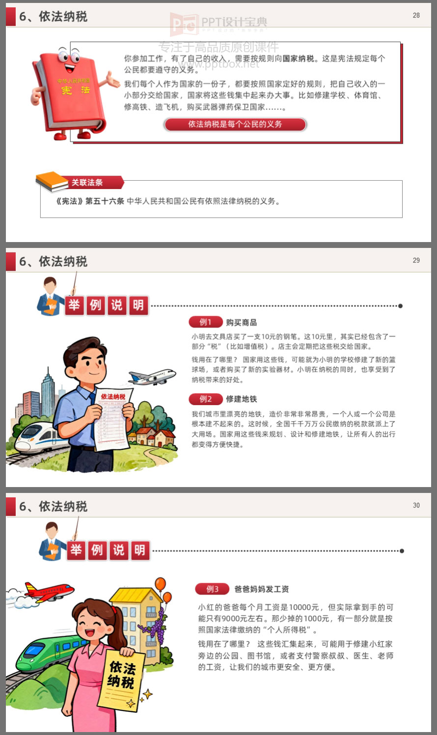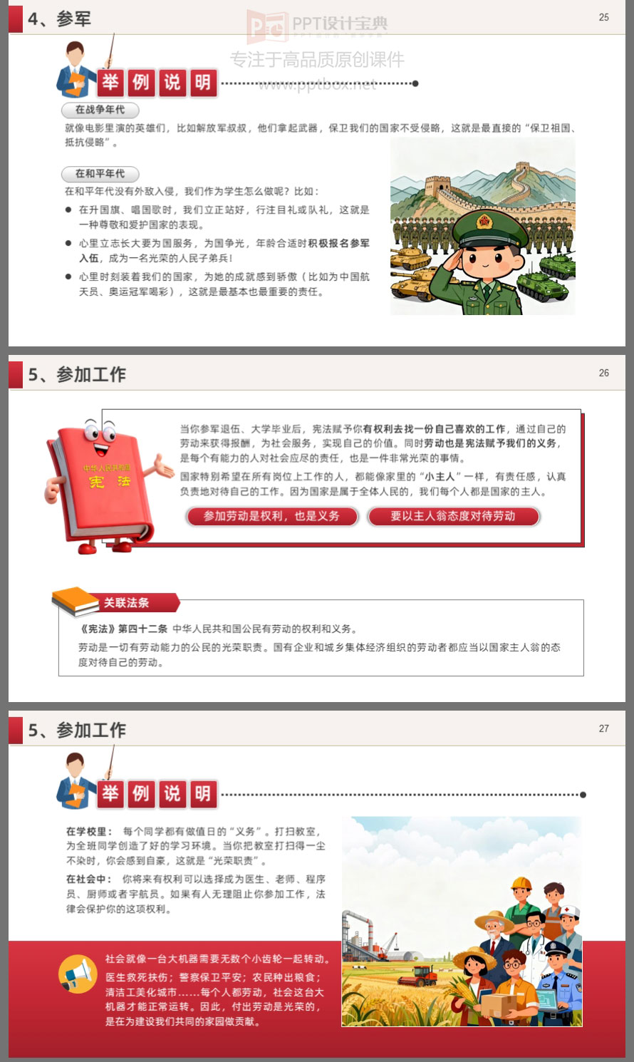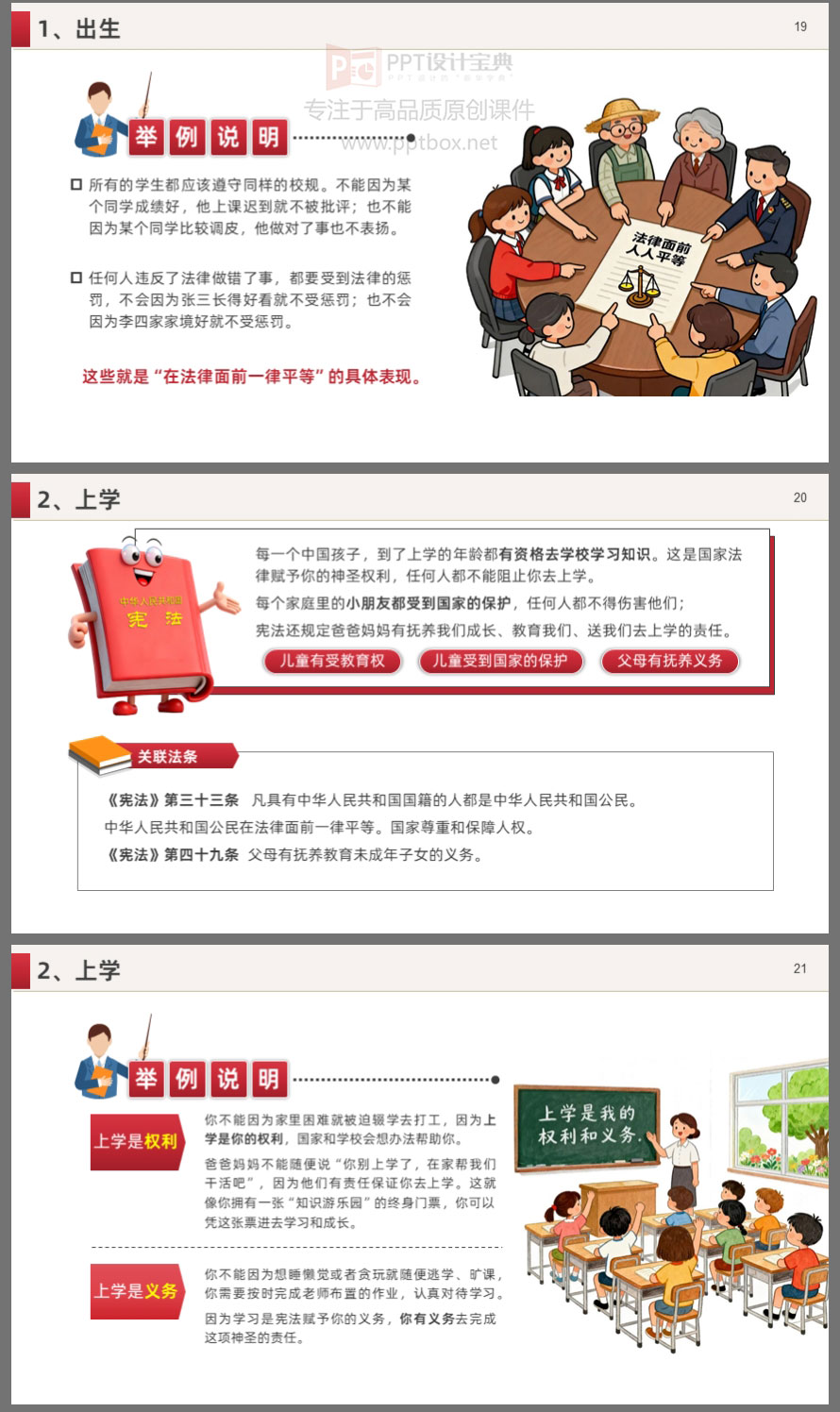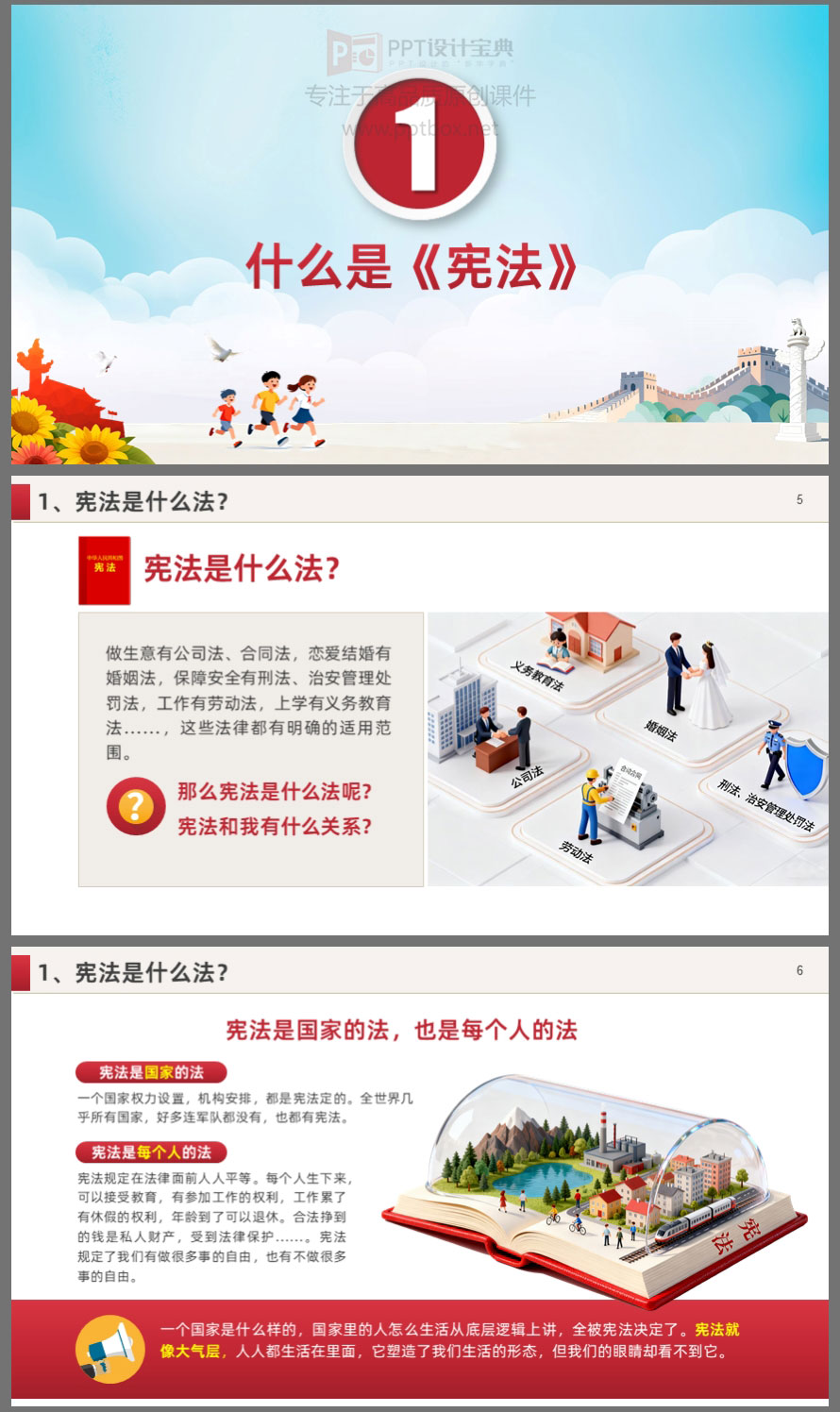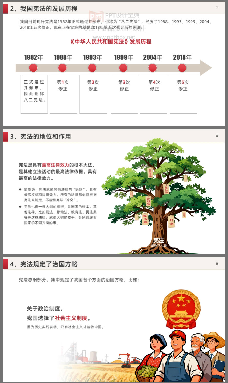 这是一个给青少年《宪法》普法PPT,以2018年修订版宪法为蓝本,图文并茂的讲了宪法的地位和作用、重点讲了宪法与我们的一生的关系,讲解了公民的权利和义务,适合于国家宪法日普法、中小学生法治教育课等。本PPT共47页,内含WORD讲稿,图文并茂,设计精美,易于编辑修改。