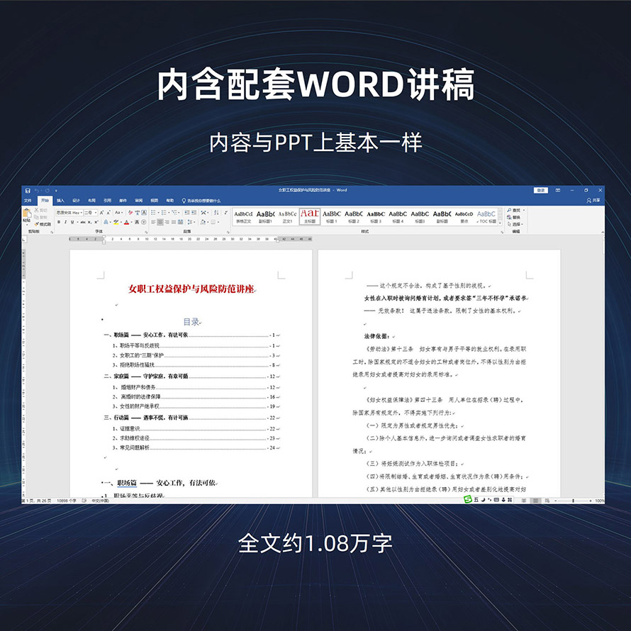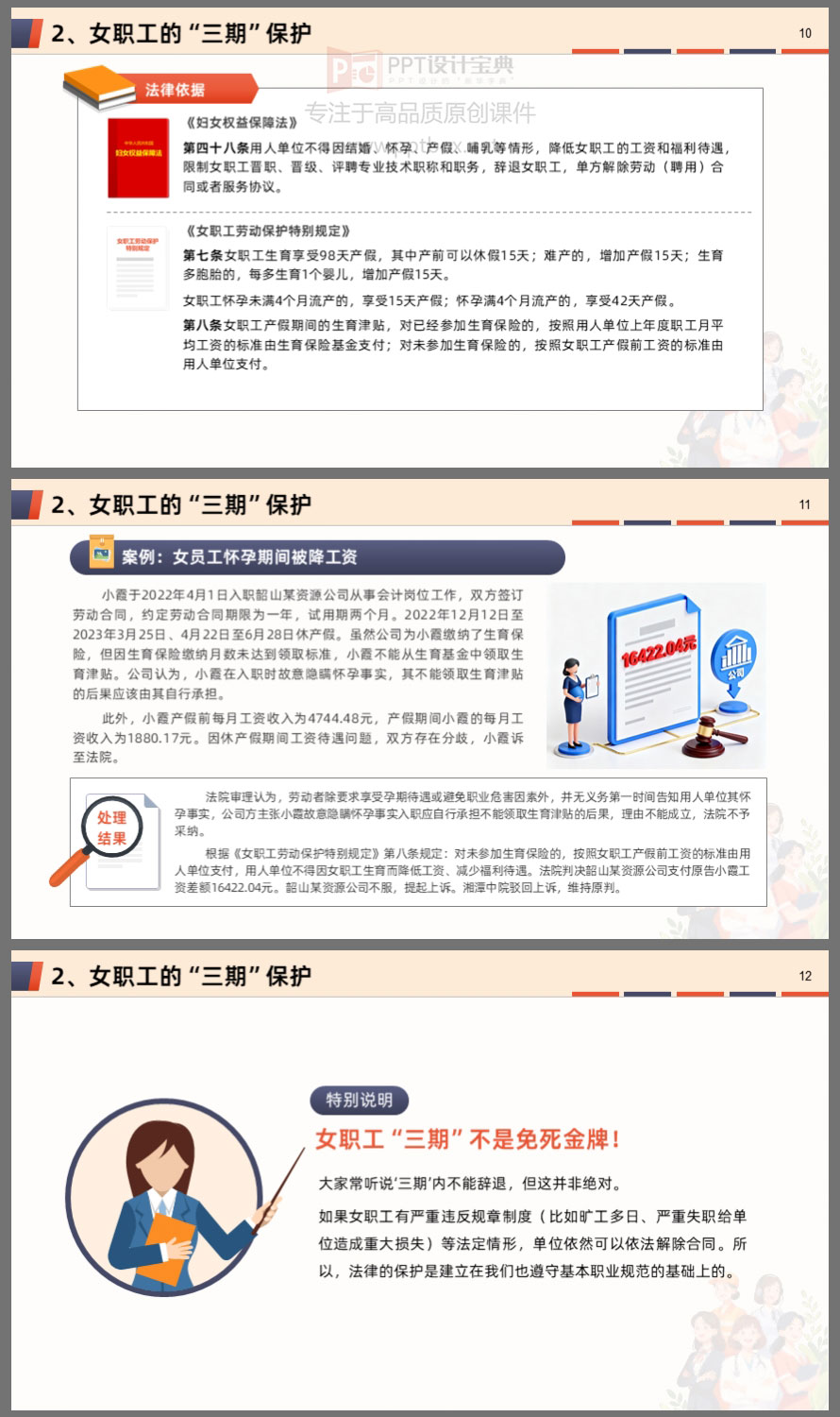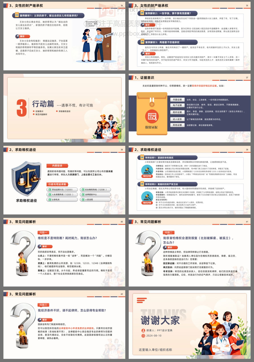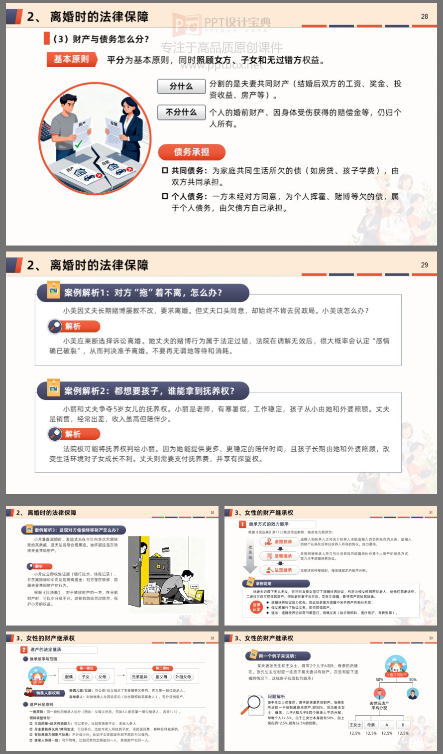 本课件围绕女性在职场、家庭及维权行动中的核心权益,系统解读了职场平等、“三期”保护、反性骚扰、婚姻财产、离婚保障、财产继承等关键议题。内容结合真实案例与法律条文,帮助女性明晰自身权利,掌握维权方法,提升风险防范意识。无论是职场中的不公平待遇,还是家庭中的财产纠纷,都能在此找到法律依据与应对策略。学法用法,守护权益,让每一位女性在职场与生活中更有底气、更有尊严。