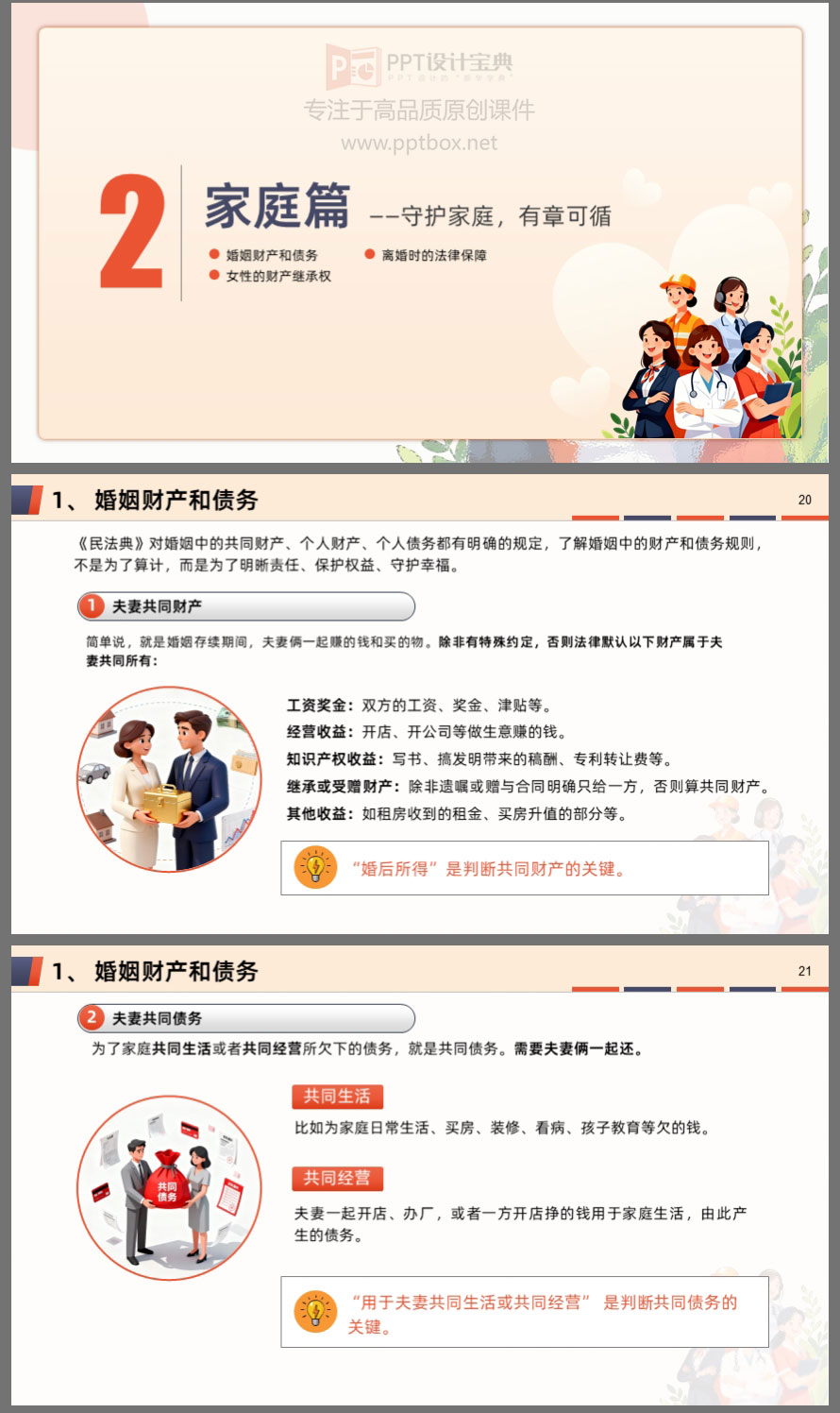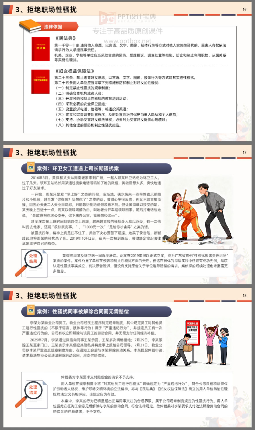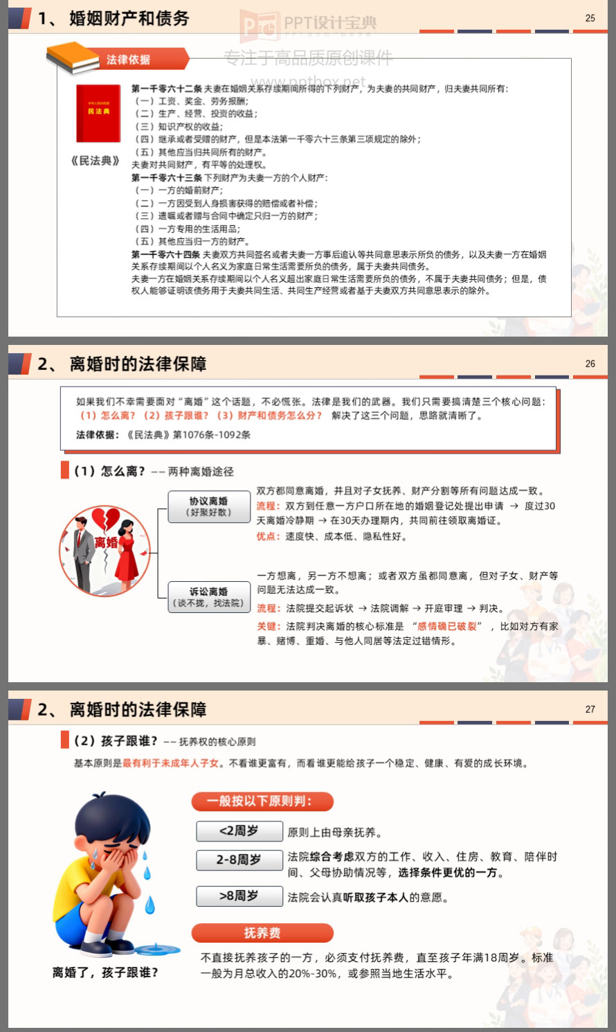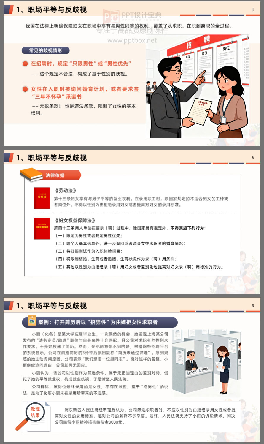 本课件围绕女性在职场、家庭及维权行动中的核心权益,系统解读了职场平等、“三期”保护、反性骚扰、婚姻财产、离婚保障、财产继承等关键议题。内容结合真实案例与法律条文,帮助女性明晰自身权利,掌握维权方法,提升风险防范意识。无论是职场中的不公平待遇,还是家庭中的财产纠纷,都能在此找到法律依据与应对策略。学法用法,守护权益,让每一位女性在职场与生活中更有底气、更有尊严。