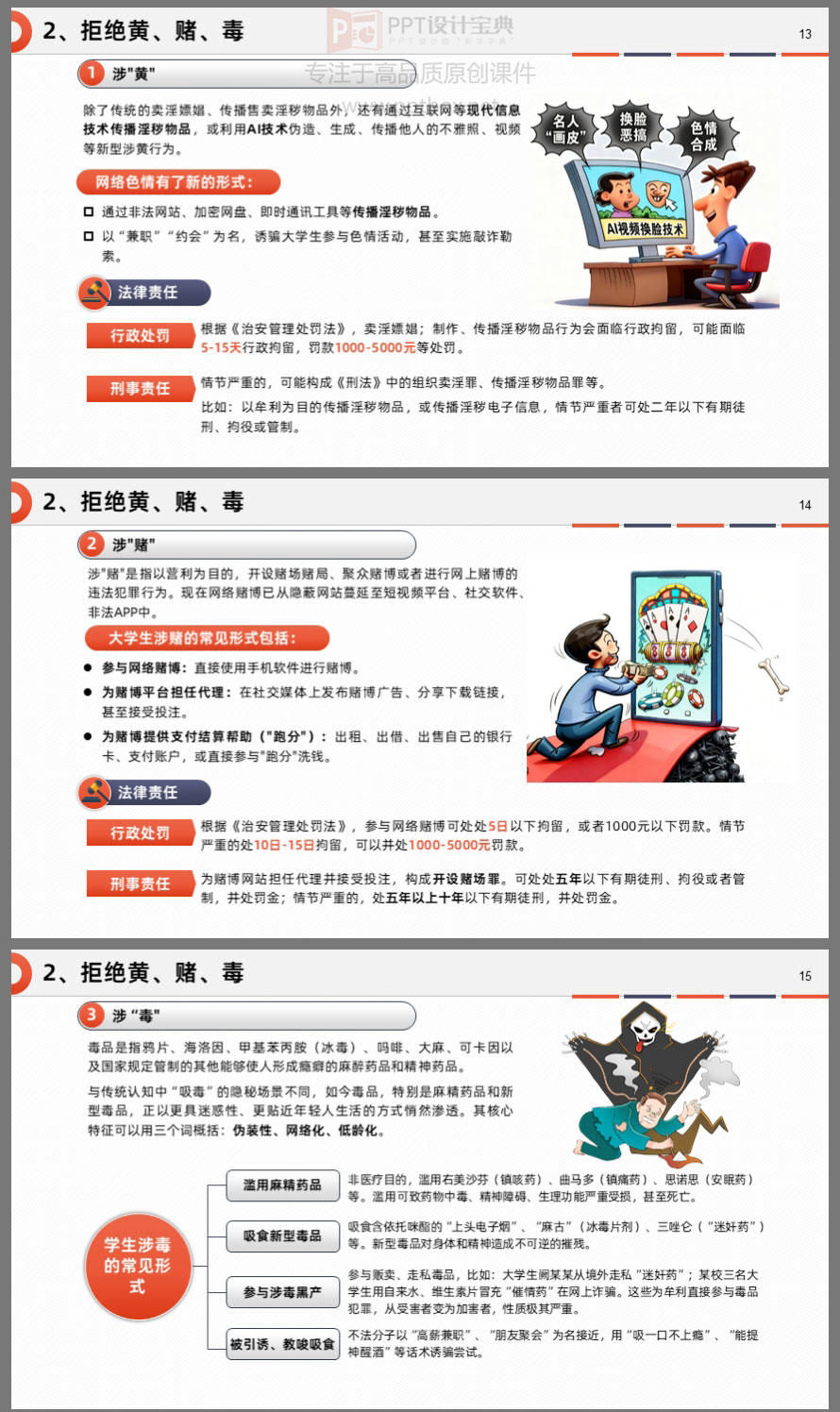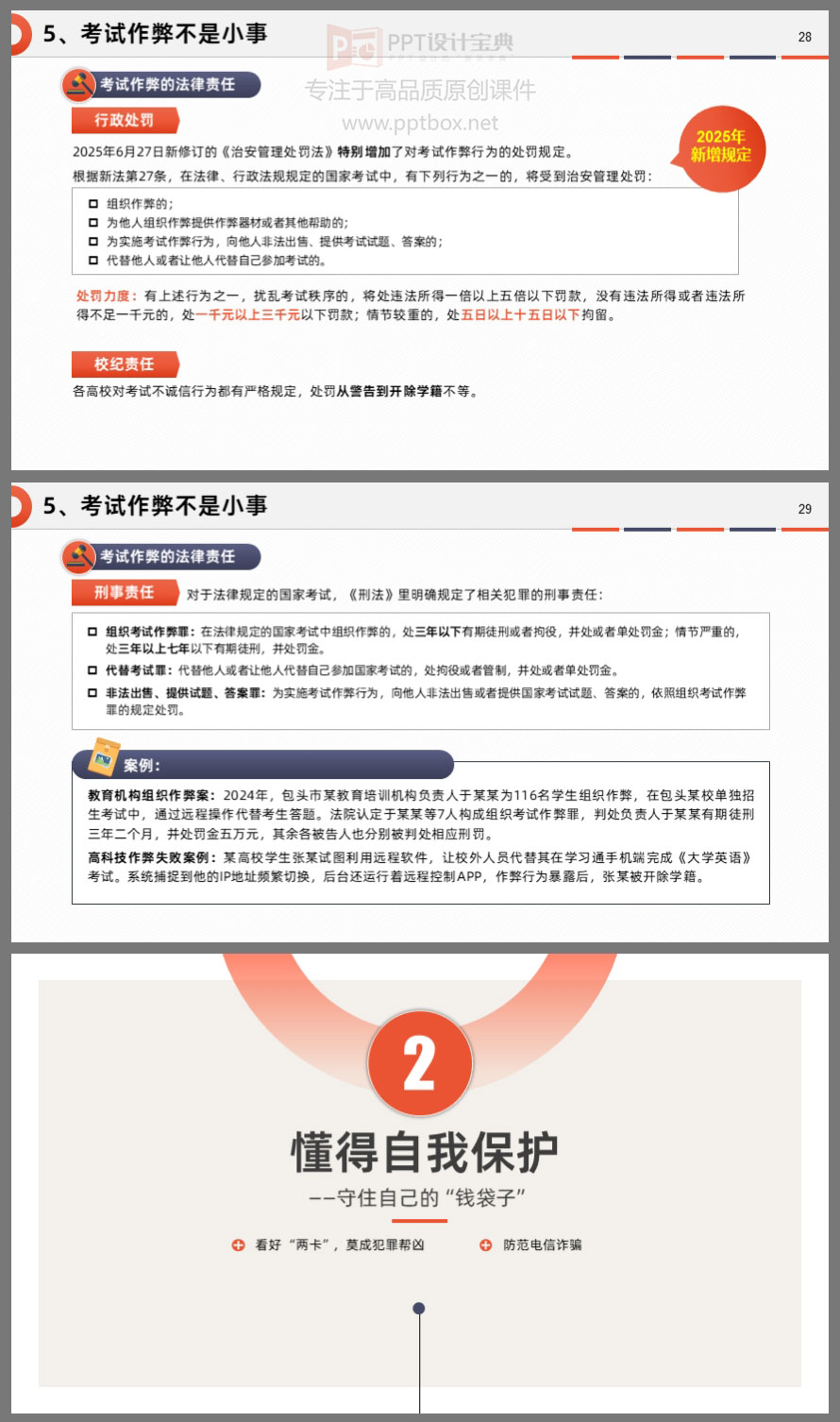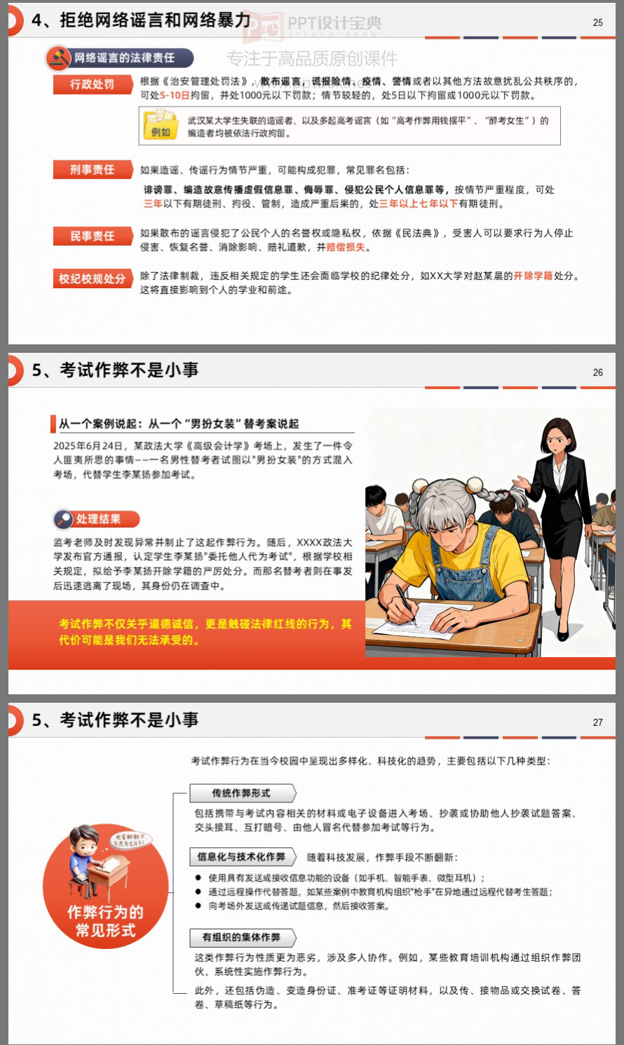 我们不讲枯燥法条,只分析你身边最真实的案例:打架斗殴的“天价成本单”、沦为犯罪帮凶的“两卡陷阱”、AI换脸下的网络暴力、以及“黄赌毒”的新型伪装……课件深度剖析考试作弊、电信诈骗、顺手牵羊等高频风险,并提供清晰的维权指南。内容源自真实案例,旨在帮你识别陷阱、规避风险、守护财产与前途。