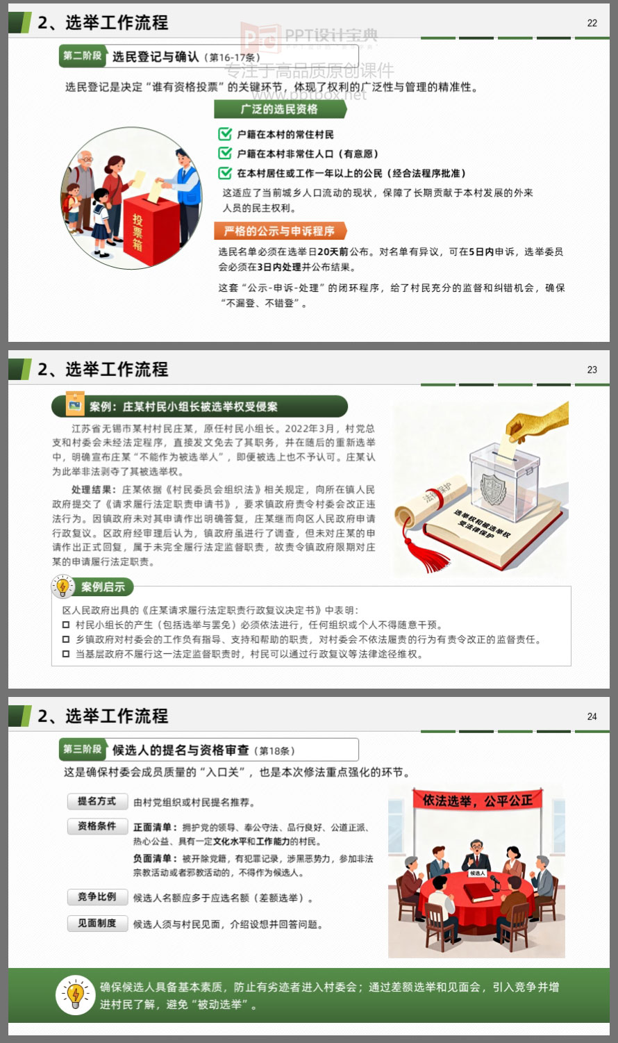 新修订的《村民委员会组织法》将于2026年正式实施,这是基层民主与乡村治理的重要里程碑!本次修订全面强化党的领导,完善“五个民主”全链条,明确村委会职责与选举程序,更增设“人居环境”委员会,助力美丽乡村建设。课件逐条解读法律亮点,涵盖村委会定位、选举流程、村民会议职权、民主监督机制等内容,并附真实案例解析,助你深入理解村民自治的法治路径。适合村干部、基层工作者、法律学习者与关心乡村治理的你!