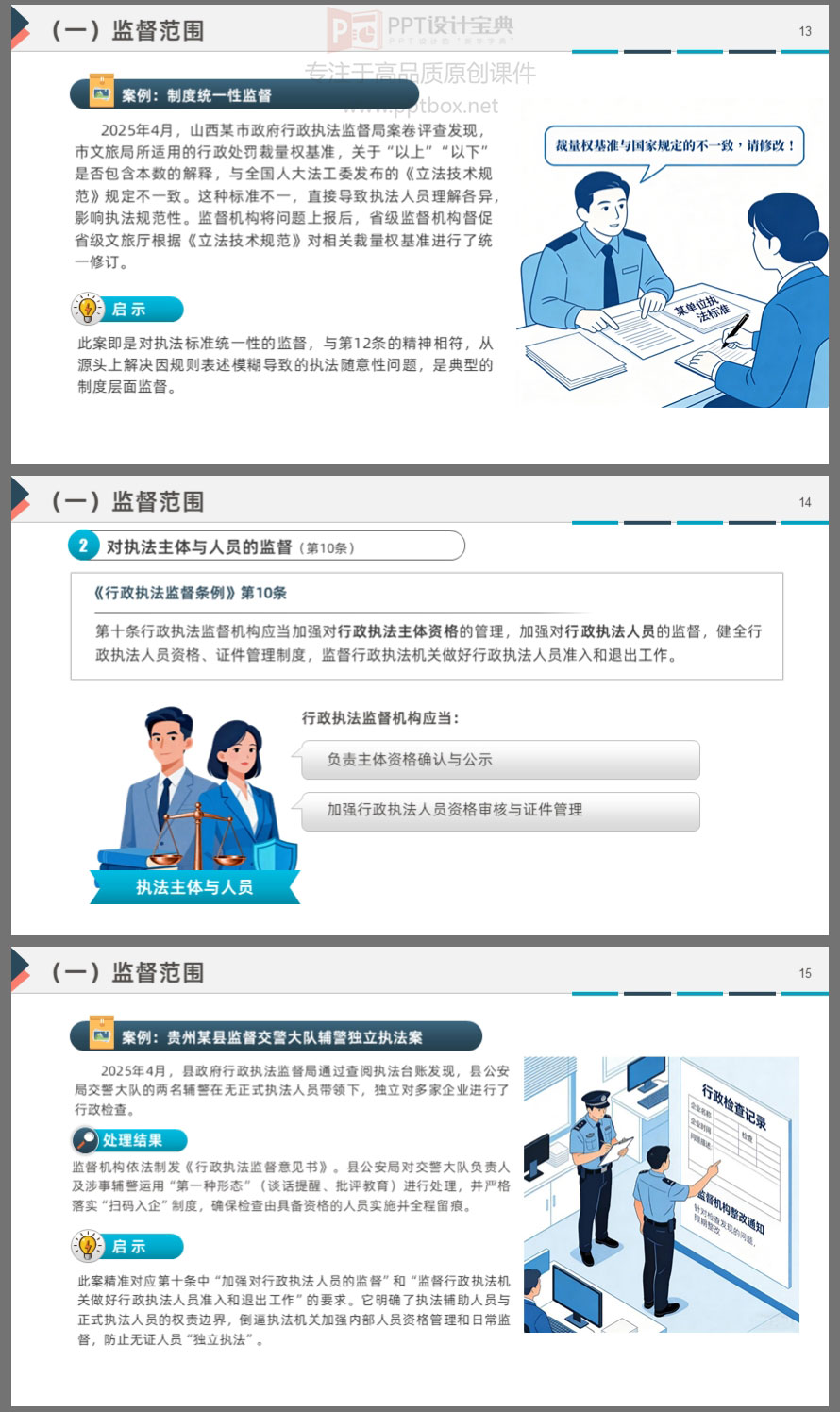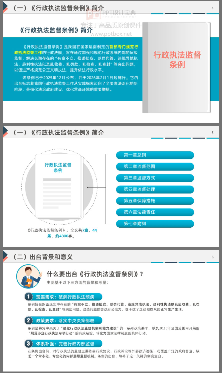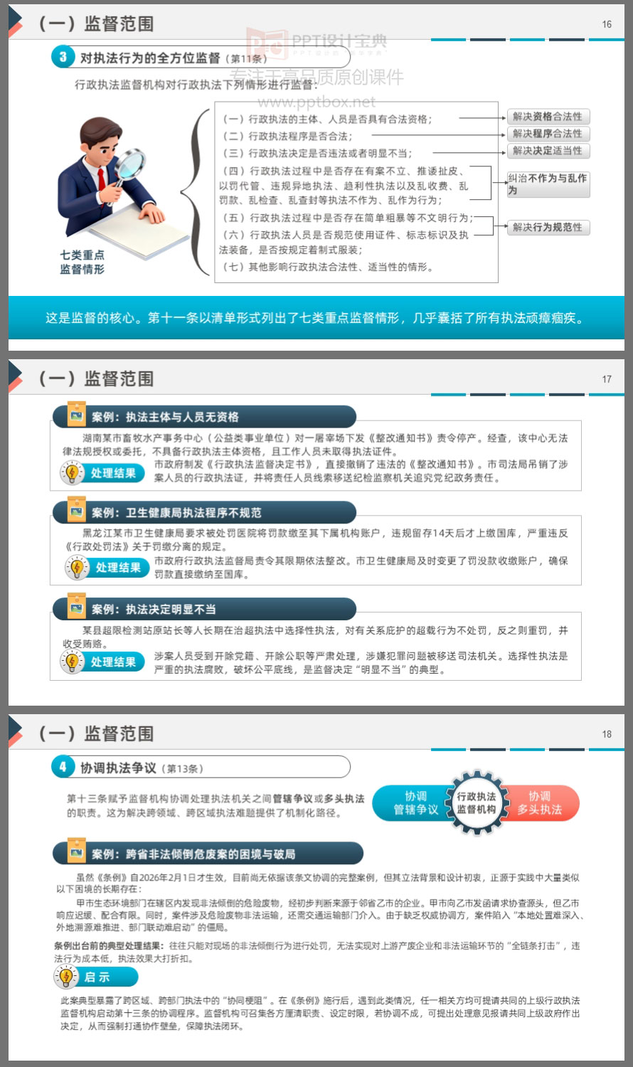 《行政执法监督条例》已于2026年2月1日正式实施!这是我国首部国家层面专门规范行政执法监督的行政法规,旨在破解“有案不立、推诿扯皮、趋利性执法、乱罚款、乱检查”等顽疾,真正推动严格规范公正文明执法。条例明确了监督主体、范围和方式,构建了从日常检查到专项监督、从督促纠错到强制处理的完整监督链条。它不仅是约束执法行为的“紧箍咒”,也是保护市场主体和群众权益的“护身符”。本课件全面解读条例重点,带你了解监督如何落地、执法如何规范、你我如何参与。