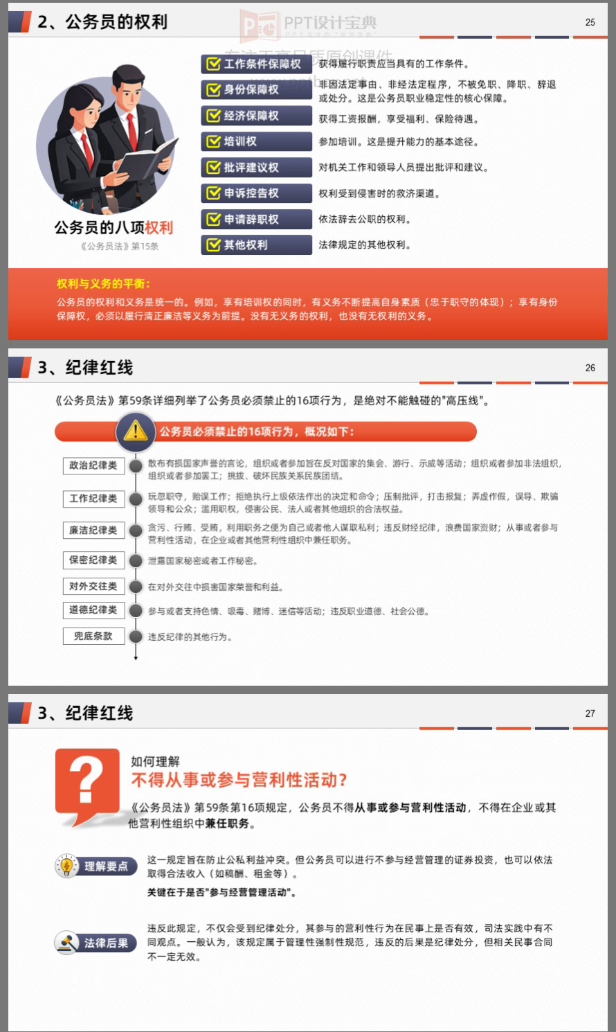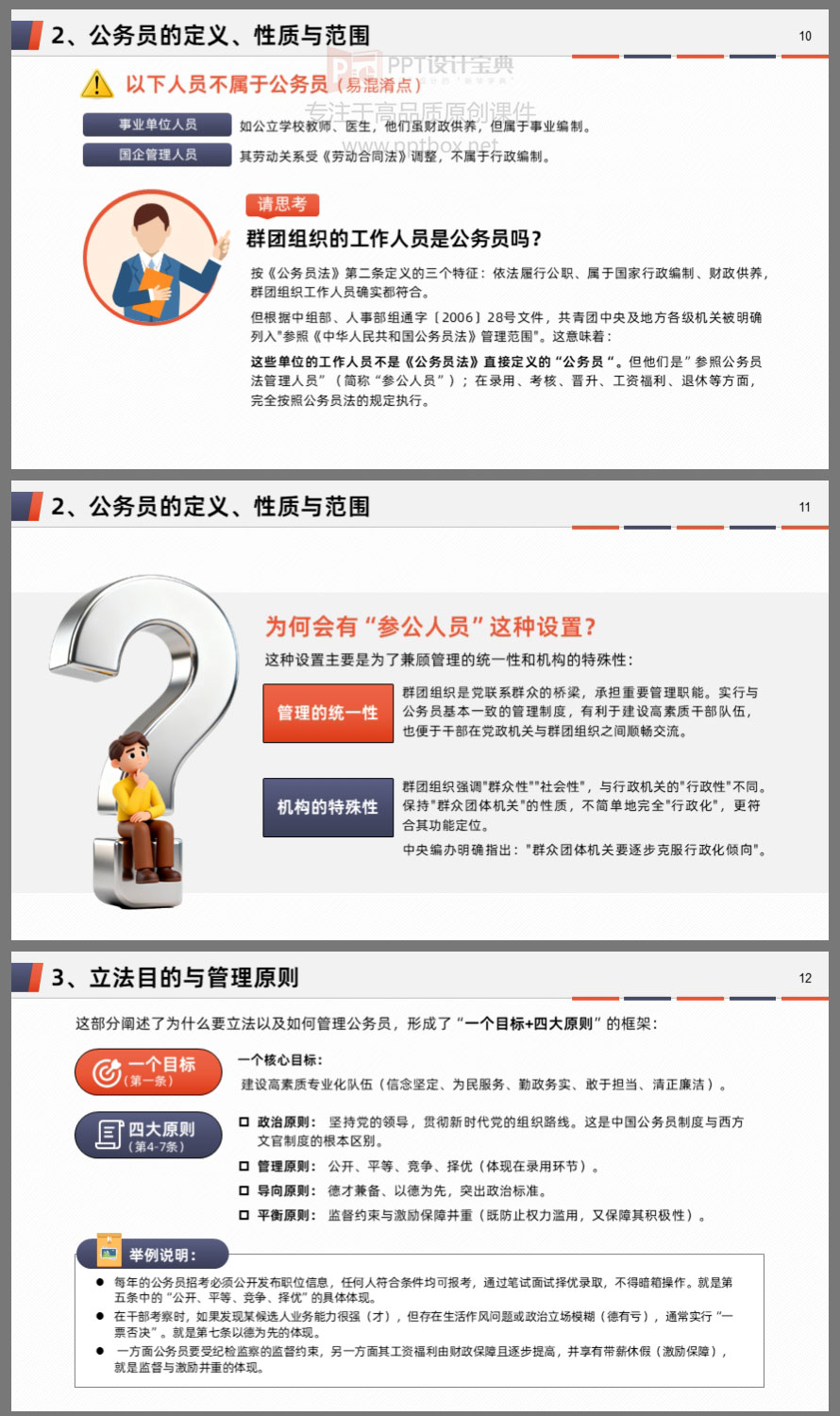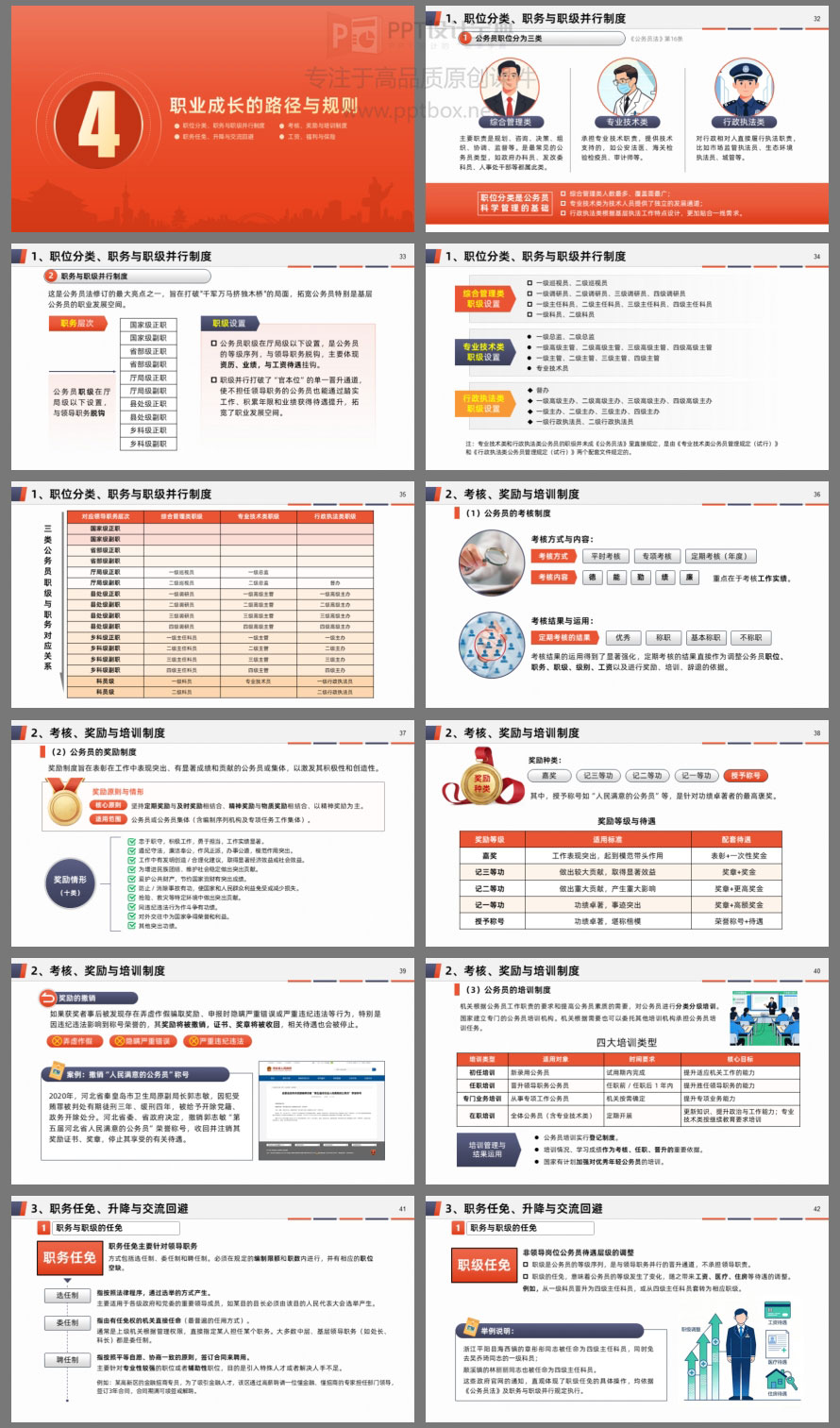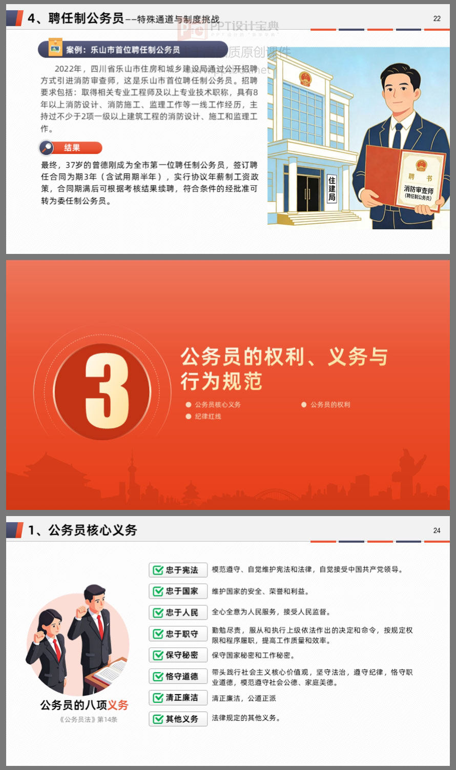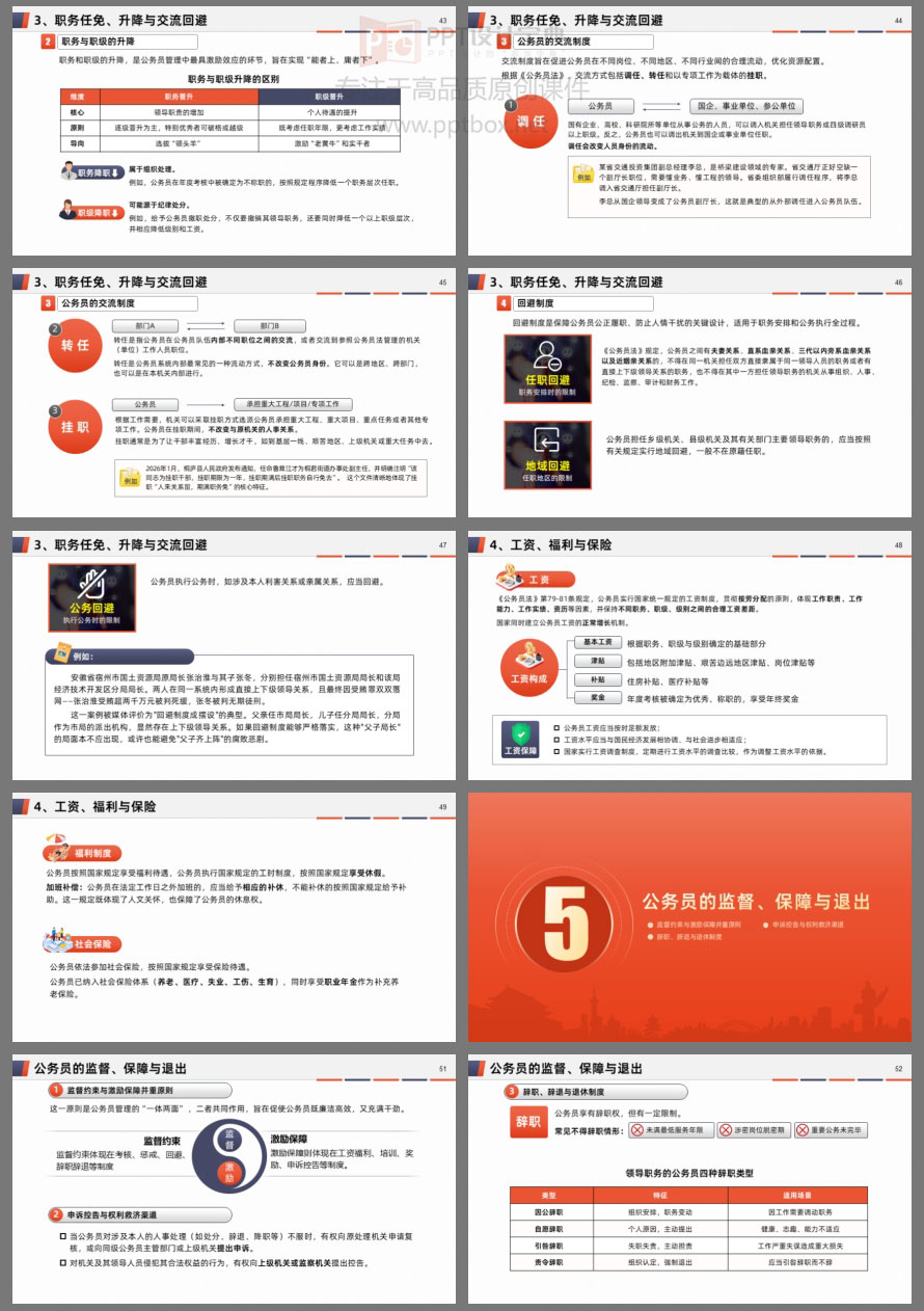 这份PPT课件基于最新《公务员法》及配套法规精心制作,共六大模块、50+页干货,全面覆盖公务员管理的每一个关键环节: