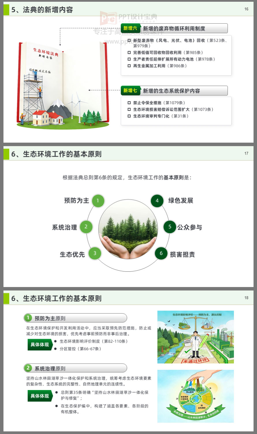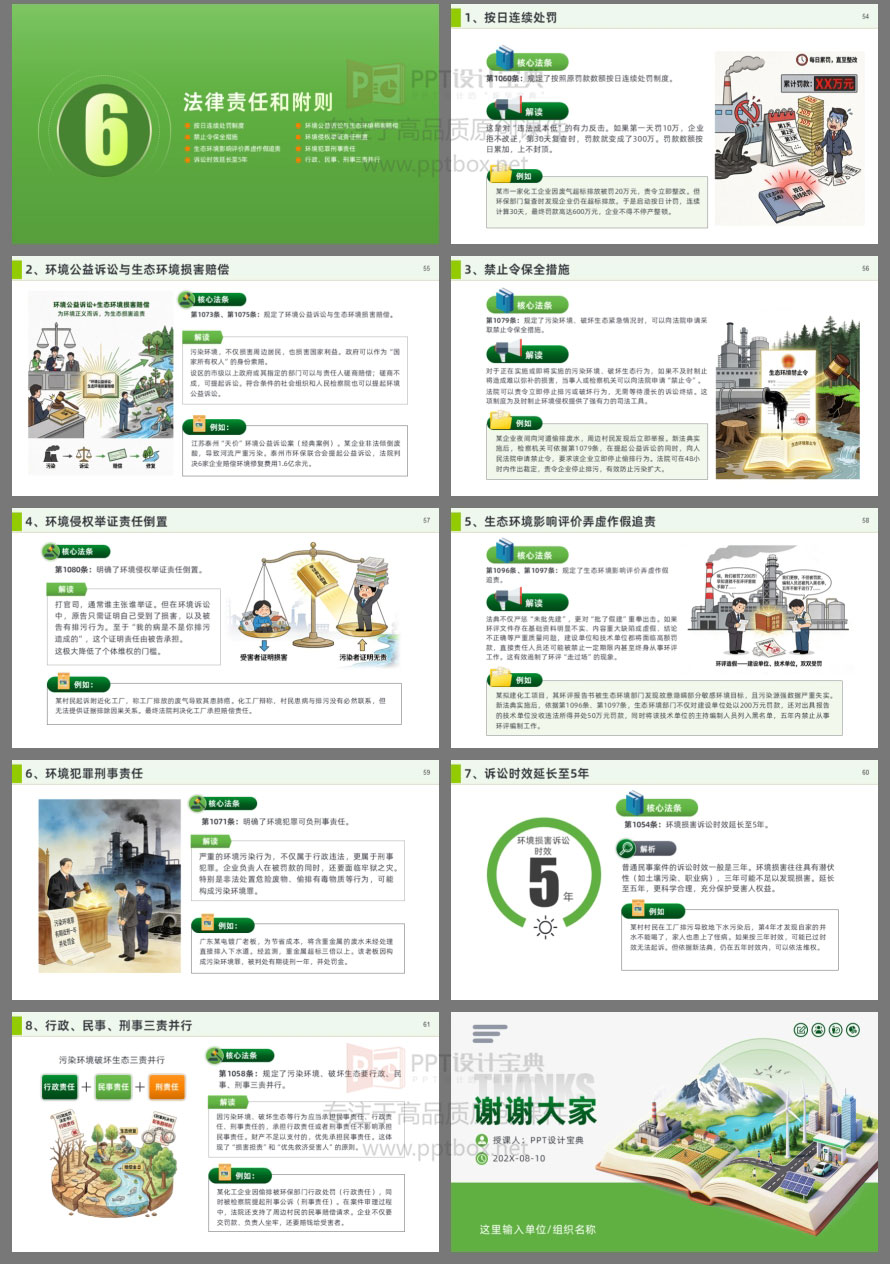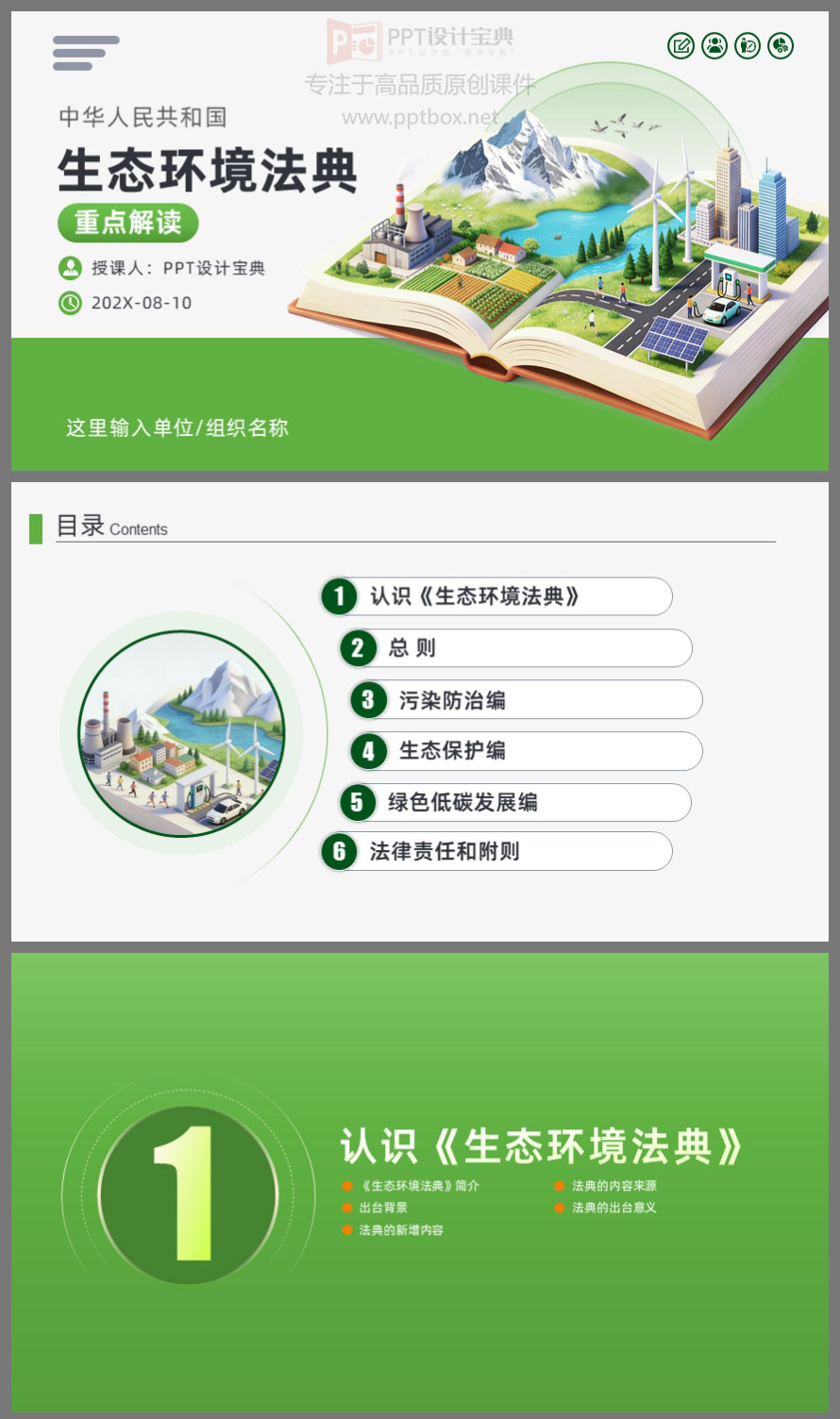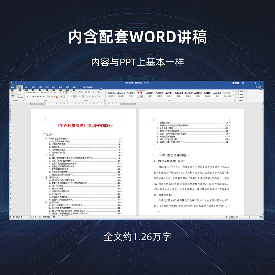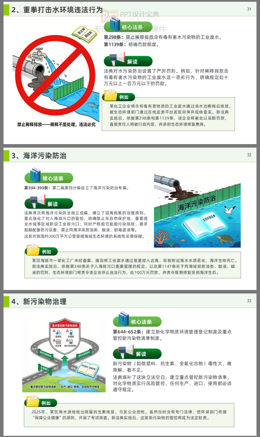 这个PPT课件系统梳理了法典的五大板块中最重要的一些规则:总则(生态环境元概念、督察制度、分区管控、生态补偿)、污染防治编(排污许可核心制、新污染物、海洋/噪声/光/电磁辐射污染)、生态保护编(科学绿化、生态修复、人兽冲突、荒漠高原保护)、绿色低碳发展编(生产者责任延伸、碳交易、碳足迹、绿色采购)、法律责任编(按日连续处罚、公益诉讼、禁止令、举证倒置、三责并行)。让法律从业者、环保管理人员、法考学生及企业EHS部门快速掌握法典核心内容,适合用于个人学习、单位培训或备课参考。