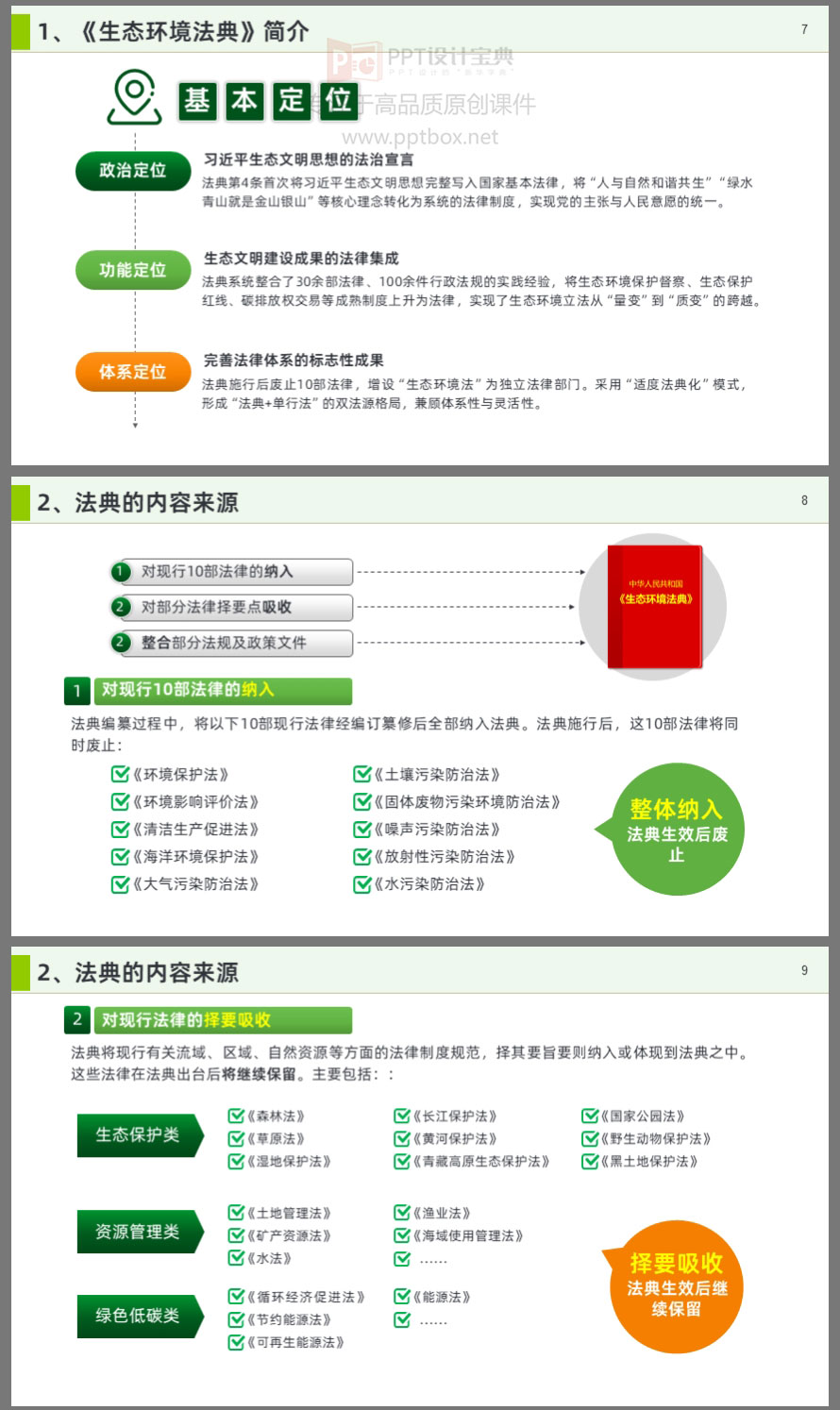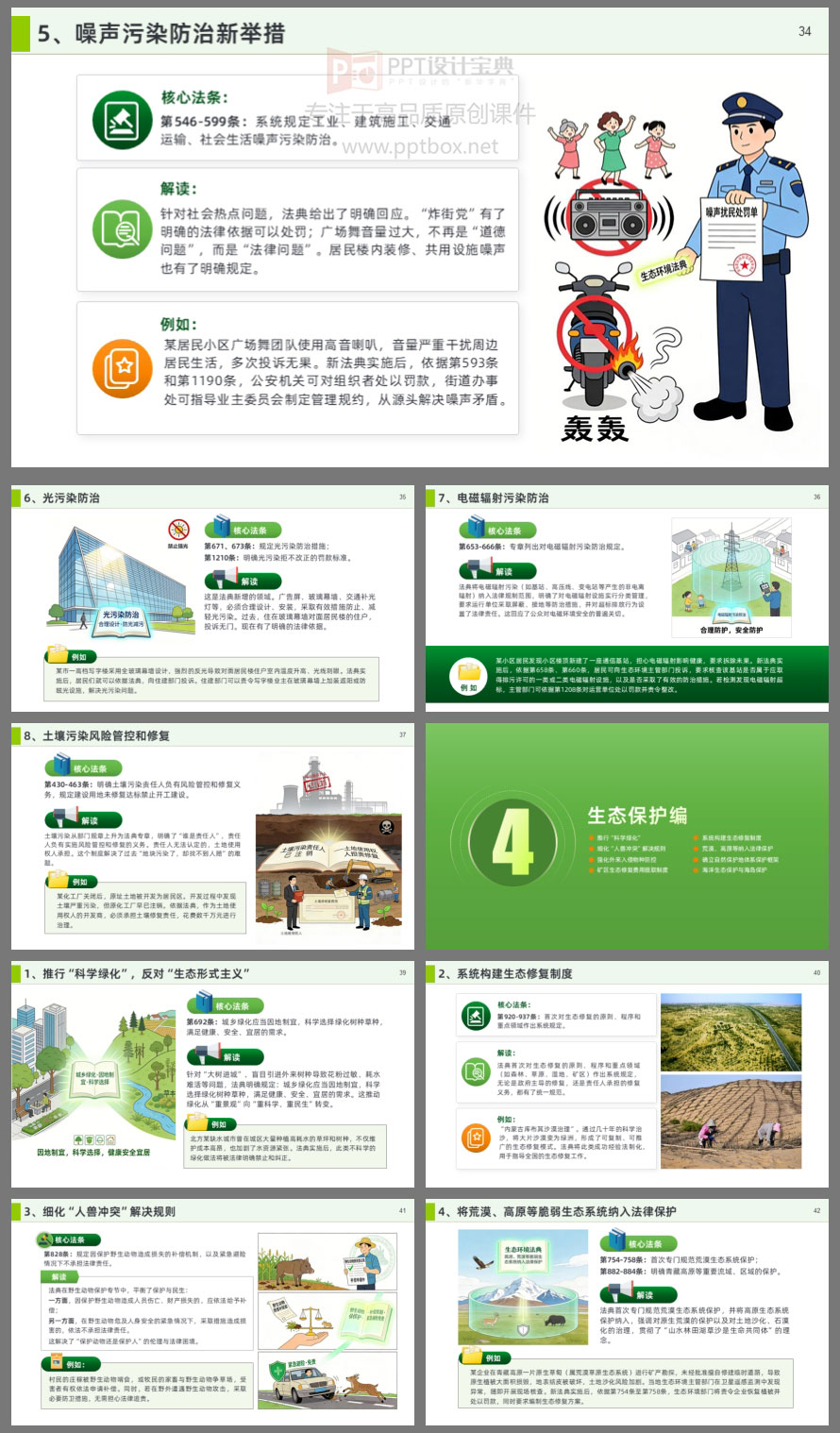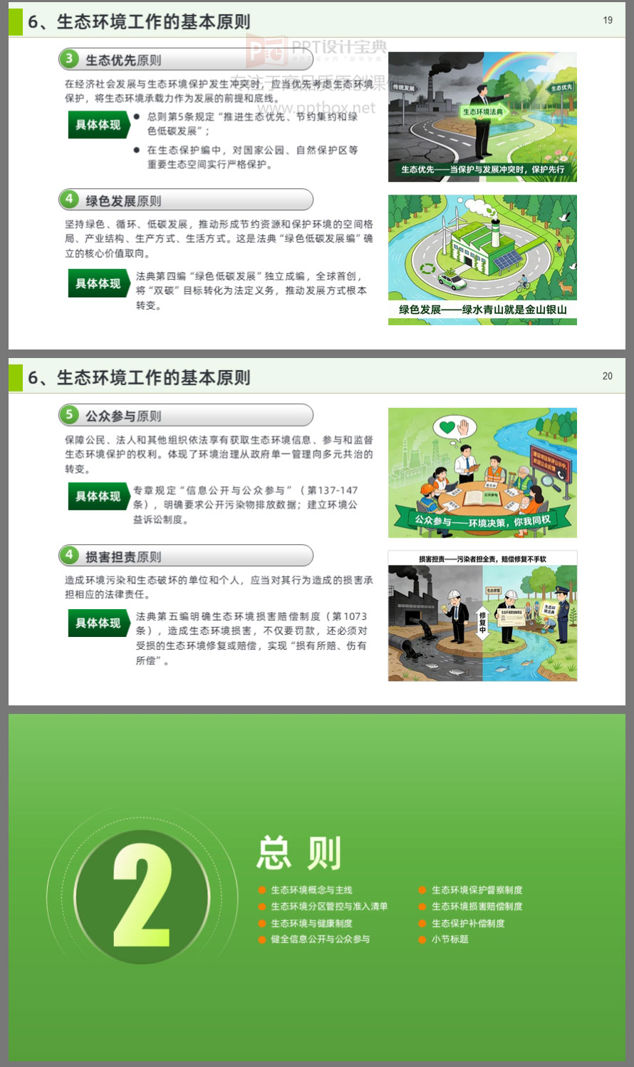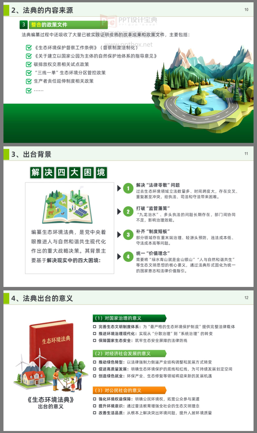 这个PPT课件系统梳理了法典的五大板块中最重要的一些规则:总则(生态环境元概念、督察制度、分区管控、生态补偿)、污染防治编(排污许可核心制、新污染物、海洋/噪声/光/电磁辐射污染)、生态保护编(科学绿化、生态修复、人兽冲突、荒漠高原保护)、绿色低碳发展编(生产者责任延伸、碳交易、碳足迹、绿色采购)、法律责任编(按日连续处罚、公益诉讼、禁止令、举证倒置、三责并行)。让法律从业者、环保管理人员、法考学生及企业EHS部门快速掌握法典核心内容,适合用于个人学习、单位培训或备课参考。