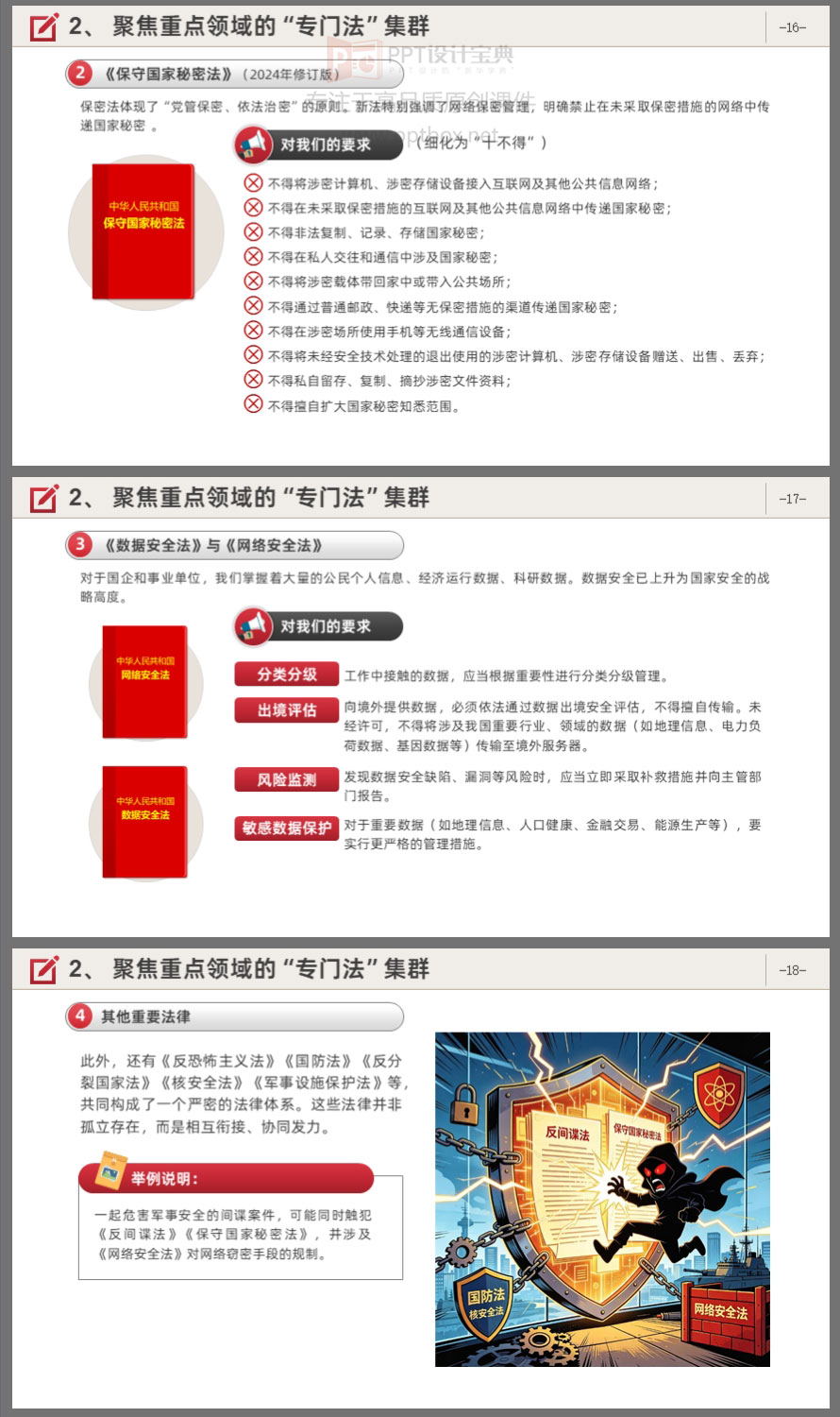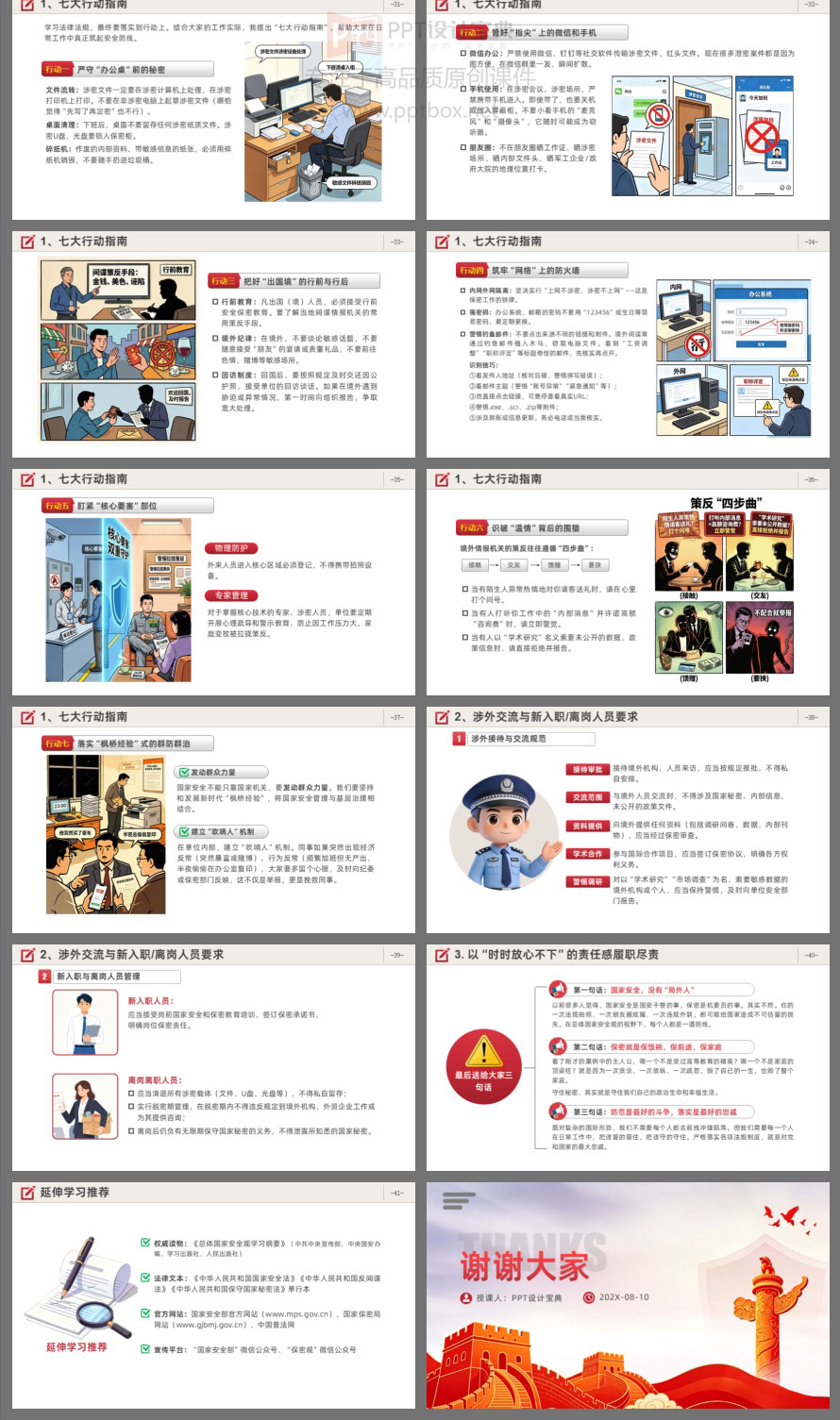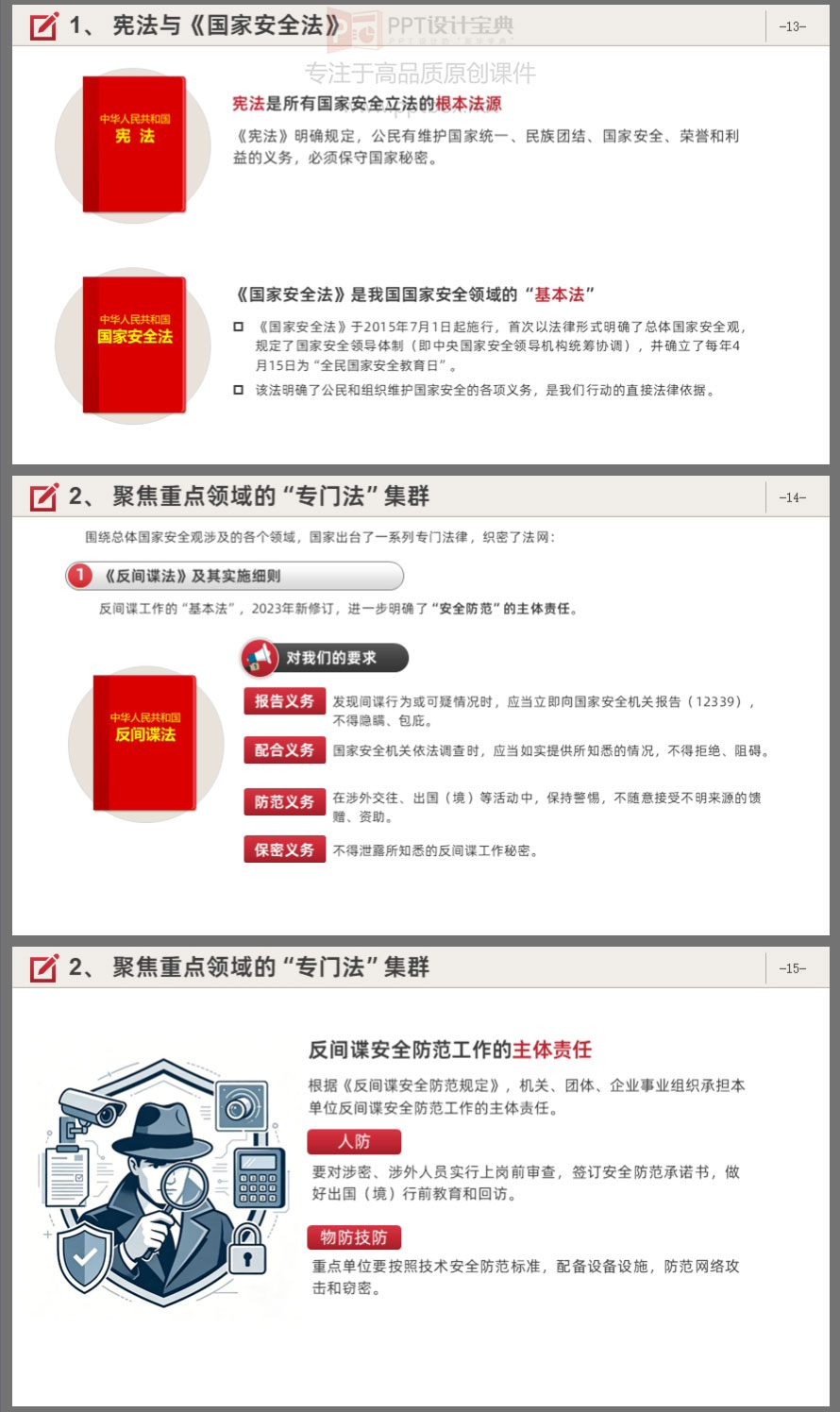 你以为国家安全只是谍战剧?错了!它就在你办公桌、朋友圈、出差途中。本PPT课件围绕总体国家安全观,系统梳理国家安全的时代内涵、法律法规体系、当前形势与典型案例,并结合“十五五”规划对安全工作的新要求,提出具体的行动指南。内容涵盖《国家安全法》《反间谍法》《保守国家秘密法》《数据安全法》等核心法律。课件结构清晰,适合机关单位、国企、事业单位开展国家安全教育培训使用。