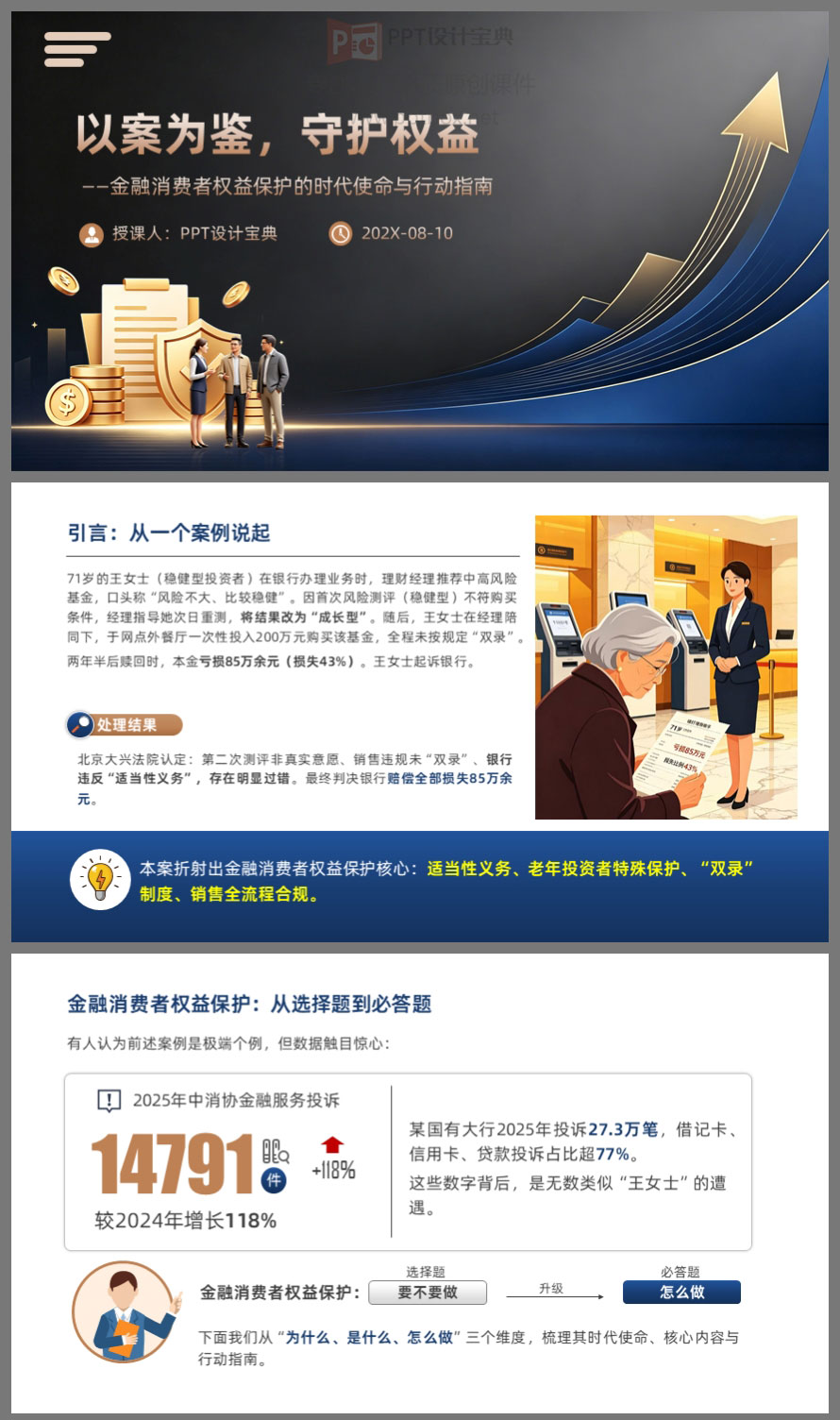 适合金融机构合规岗、一线营销人员、培训师、法务及对金融消费者权益感兴趣的学习者。课件可编辑,附完整讲稿。