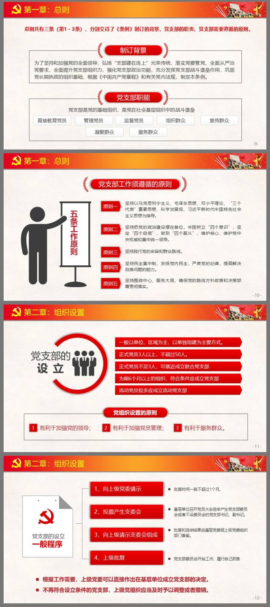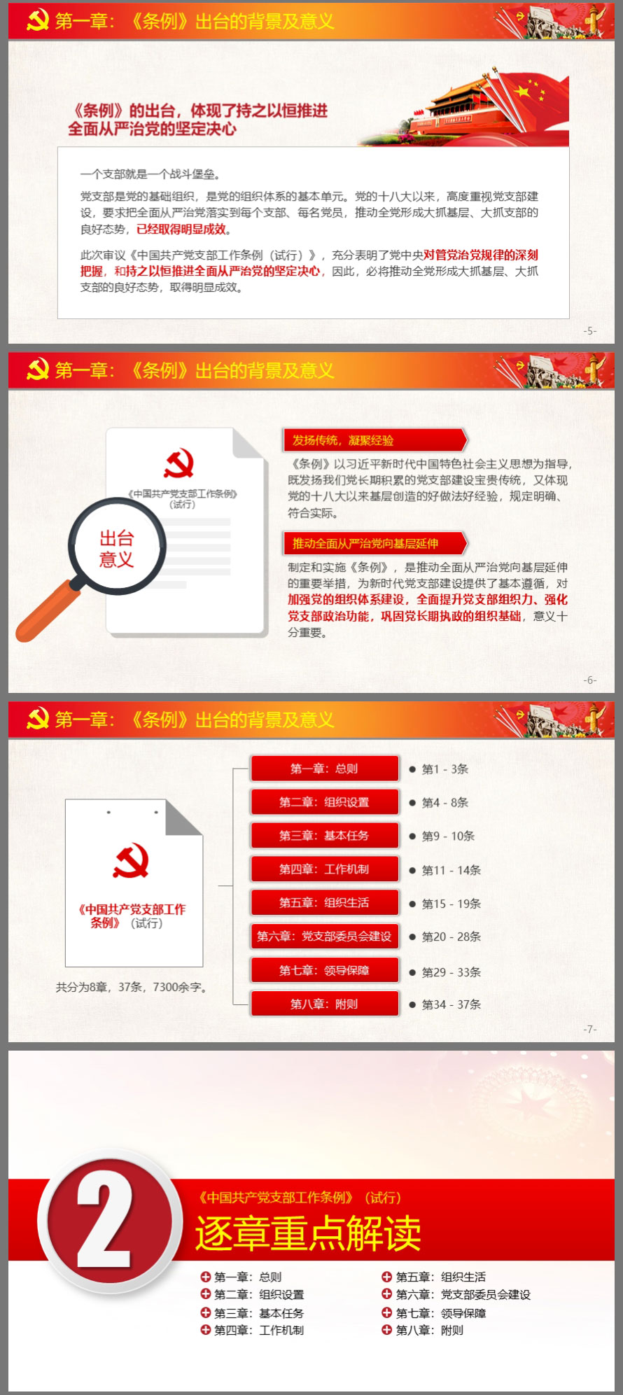 《中国共产党党支部工作条例》是党支部建设的基本遵循,于2018年9月审议的,是目前最新的党支部工作条例。《党支部工作条例》规定了党支部的组织设置、基本任务、工作机制、组织生活、党支部季员会的建设等多个方面。本课件从该条例的出台意义、逐章重点解读、贯彻和实践要求三个方面做出详细解读。